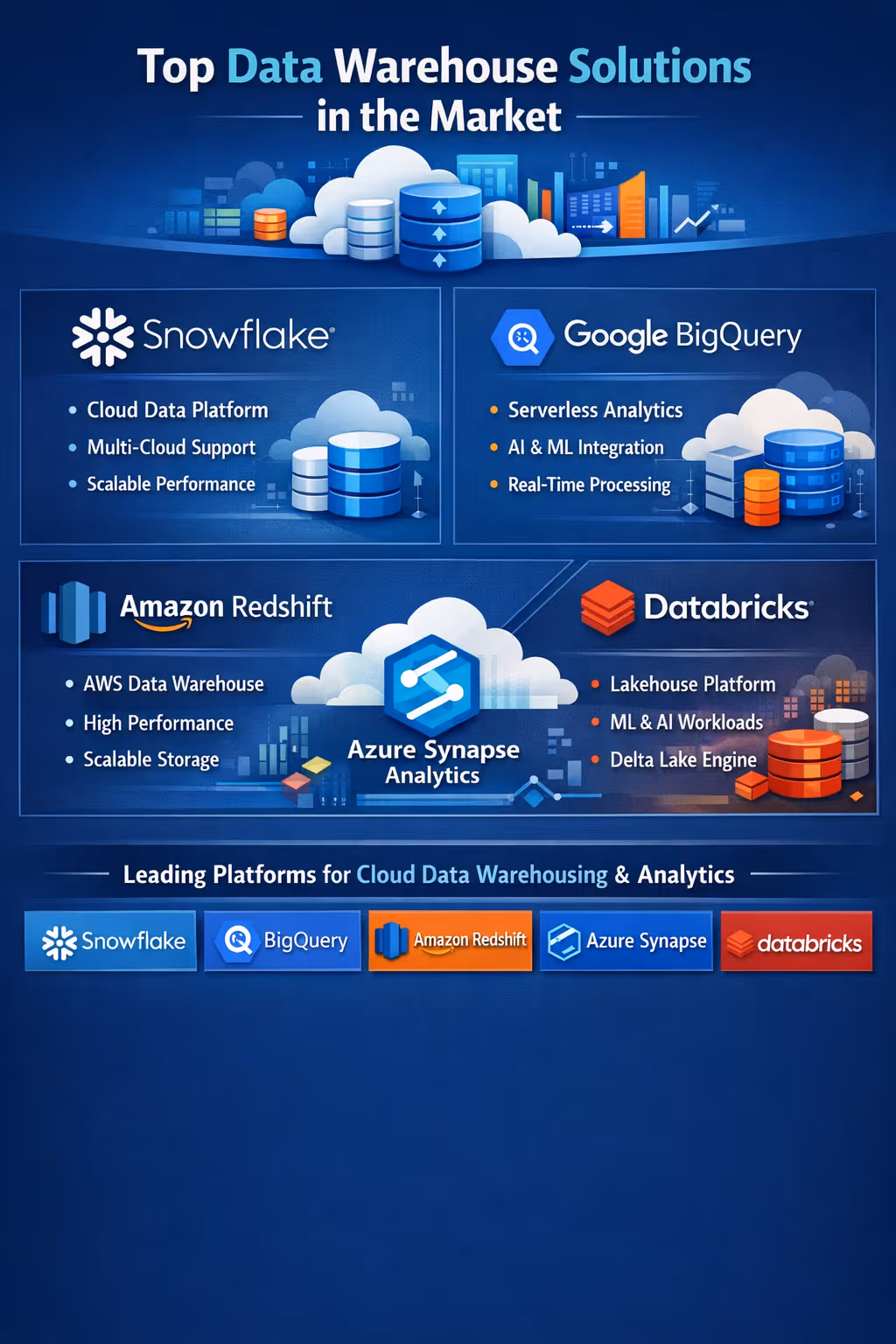 These are the modern data warehouse programs that assist organizations in handling the increasing amount of information and in the process making analytics quicker and enhanced business insight.