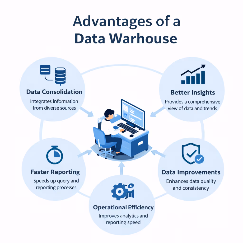 A data warehouse is a centralized repository that collects data from multiple sources to enable the analysis of large volumes of information. It helps businesses make smarter decisions. The benefits of a data warehouse go far beyond basic reporting. It provides organizations with strategic intelligence, historical analysis, and scalable analytics capabilities.